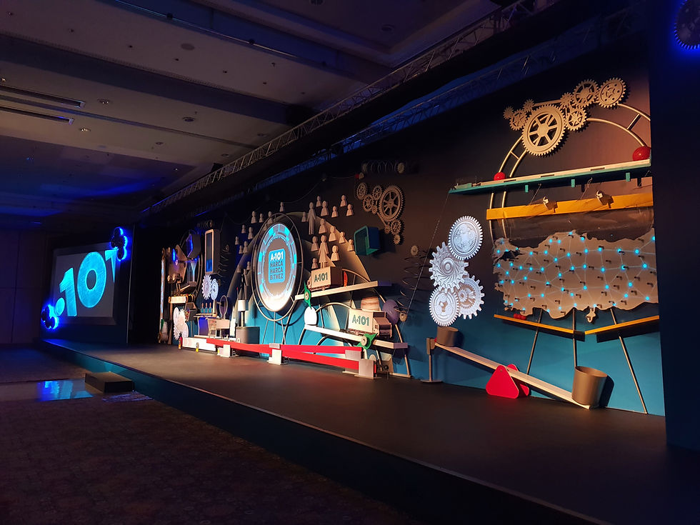 The stage and gift design created for the A101 meeting, developed in collaboration with A101 and built on a chain-reaction storytelling concept aligned with the brand’s core values, was designed and produced by Bâb-ı Zen.